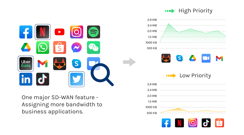 アプリケーションの優先制御は「QoS」ともいわれます。様々なオンラインサービス、例えばOffice365、Gmail、Salesforce、WebEx、Zoom、ERP、金融のオンラインシステムなどは企業の帯域幅を大量に消費します。この機能はアプリケーションの優先度を調整することでネットワークスループットを最大限に活用できるようにします。重要なアプリケーションは帯域幅を確保し、その他のアプリケーションは帯域幅の利用を抑えます。
